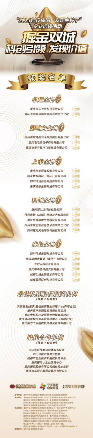 On January 12th, the award ceremony of the “2021 Venture Capital Chengdu-Chongqing · Discovering Golden Seeds” enterprise selection activity with the theme of “Digging for Gold in Twin Cities, Science and Technology Innovation Leading the Discovery of Value” was held. The list of winners of five enterprise awards including the Outstanding Golden Seed and the Listed Golden Seed, as well as two institutional awards, was announced on the spot.