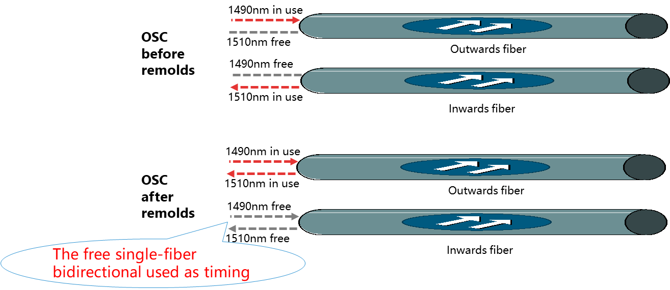 Remold plan: The OSC channel is transformed into the same optical fiber to achieve single-fiber bidirectional, and the two bands of the other optical fiber are free to do time synchronization; The scheme require two new tasks: OTN board upgrade and fiber sync device distribute.